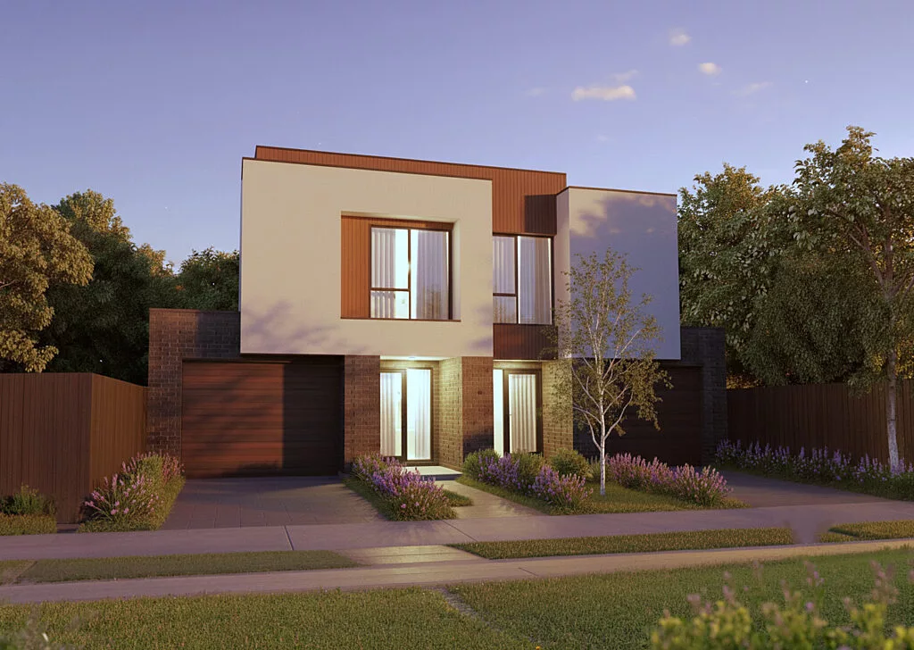 A striking composition of geometry and balance, the Palm Springs façade centres around a vertical feature element that introduces texture and depth. Framed volumes, recessed glazing, and contrasting materials create a layered, design-led outcome with a strong sense of symmetry and proportion. This façade is available as an upgrade option to elevate your dual occupancy design.